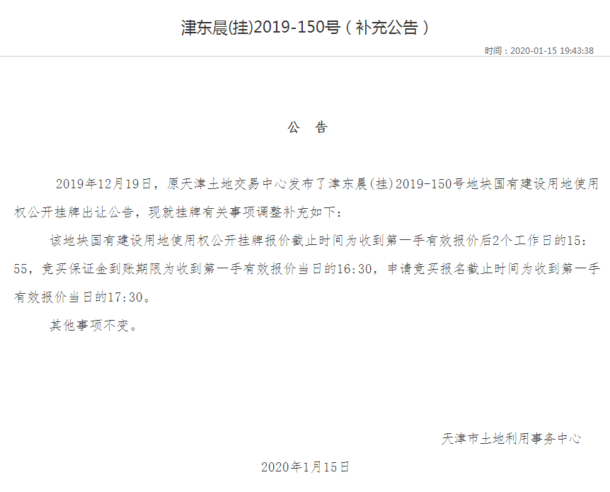 不曾想,当天晚上,土地交易中心便传来音讯,坐落河东区靖江路的津东晨(挂)2019-150号地块,因无人报价而遭受“无限延期”,“报价截止时刻为收到第一手有用报价后2个工作日的15:55”。