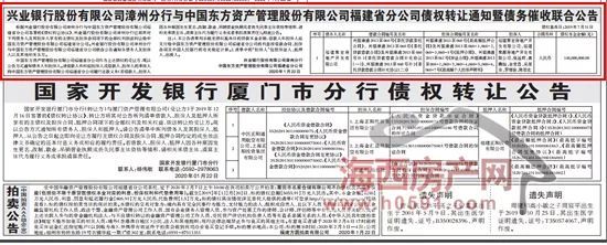 海西房产网(微信大众号:fjhxfcw)音讯:1月22日,《福建日报》刊登兴业银行股份有限公司漳州分行与我国东方财物办理股份有限公司福建省分公司债款转让告诉暨债款催收联合布告。